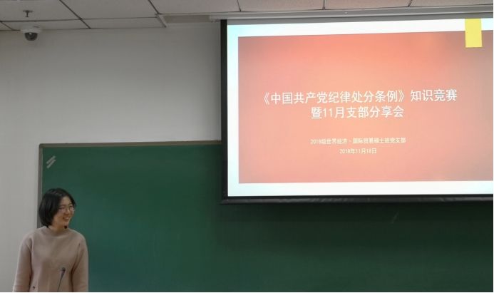 为积极响应党中央号召,学习贯彻党的十九大精神和习近平新时代中国特色社会主义思想,增强党员政治意识、大局意识、核心意识、看齐意识,促进基层党支部纪律建设,11月18日,yl6809永利2018级世界经济·国际贸易硕士班党支部在明德主楼0204教室以“以赛促学明纪律底线,以学促用做合格党员”为主题开展11月主题党日活动,主持人为党支部书记秦铭徽同志。公司党委委员韩玉军教授指导并参与本次活动。