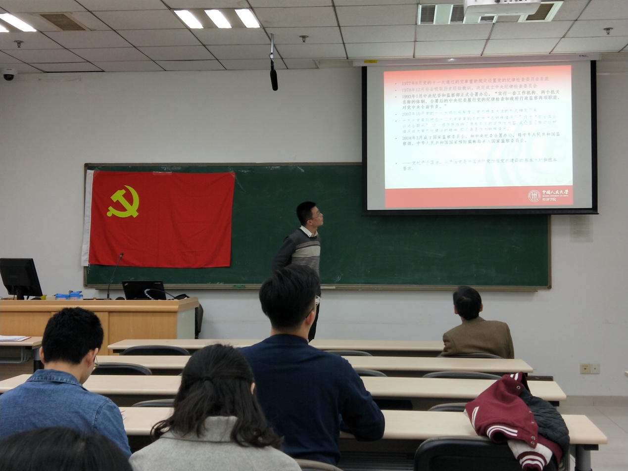 为学习贯彻习近平新时代中国特色社会主义思想和党的十九大精神,增强党员纪律意识,发挥基层党支部教育党员的作用,11月21日,2017级世界经济·国际贸易硕士班党支部在明德商学楼0208教室召开“准绳以知平直,规矩以知方圆”主题党日活动,主持人为党支部书记王芝清同志。公司党委委员韩玉军教授参与并指导活动。