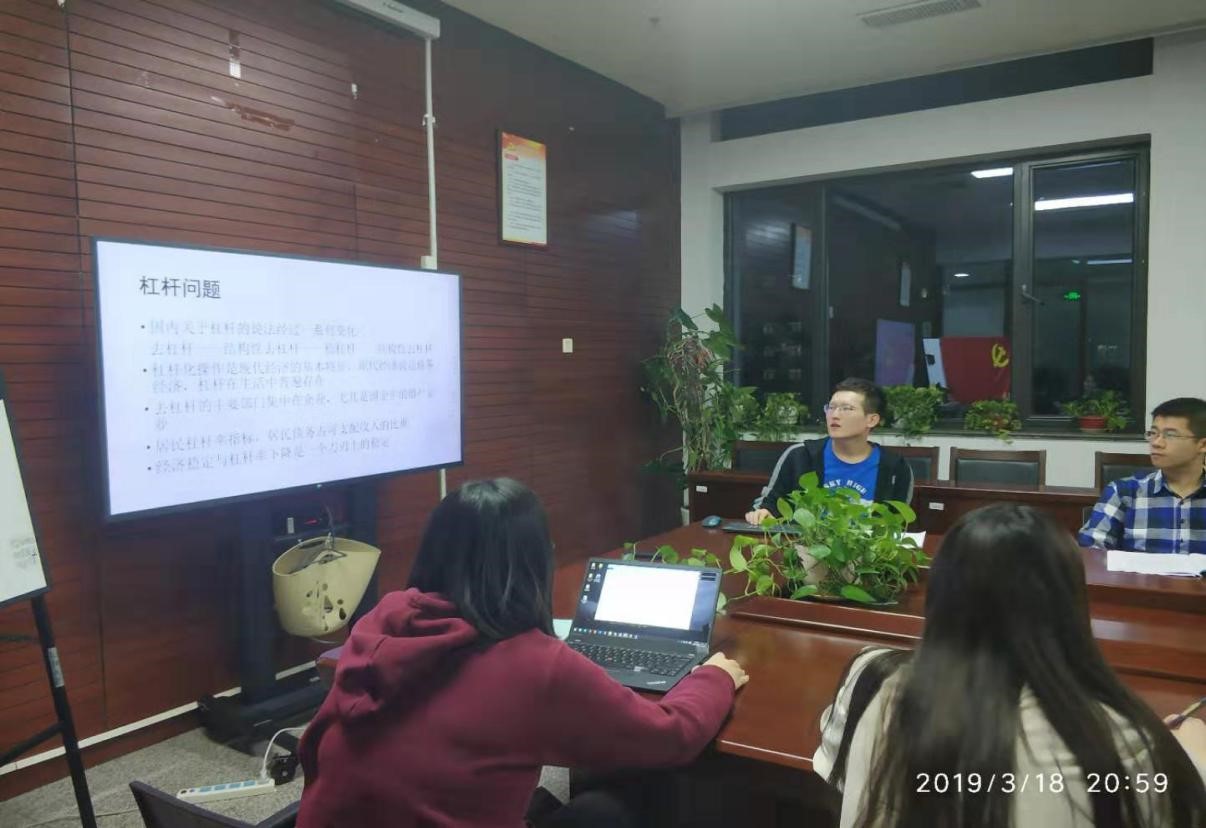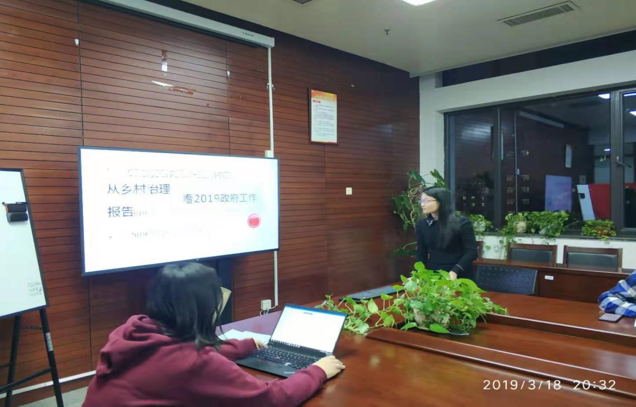 活动开始,支部成员共同学习《2019政府工作报告》(以下简称《报告》)。随后,三位成员结合自身体验分别围绕“乡村治理”“中小企业融资难、融资贵”“精准扶贫”三个主题分享心得体会。