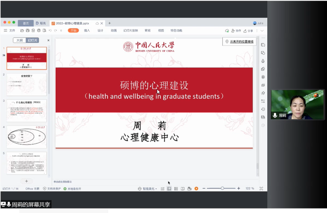 4月8日,数量经济学、发展经济学硕士、博士党支部采取线上方式联合开展以“求职就业经验分享”为主题的党日活动,聚焦考公前期准备和笔试面试经验分享;西方经济学博士党支部以线上方式开展了主题为“研究生心理健康讲座”党日活动,聚焦如何缓解毕业压力、求职焦虑,如何收获校园恋爱和维护亲密关系等心理问题,由yl6809永利集团心理健康中心周莉教授主讲。