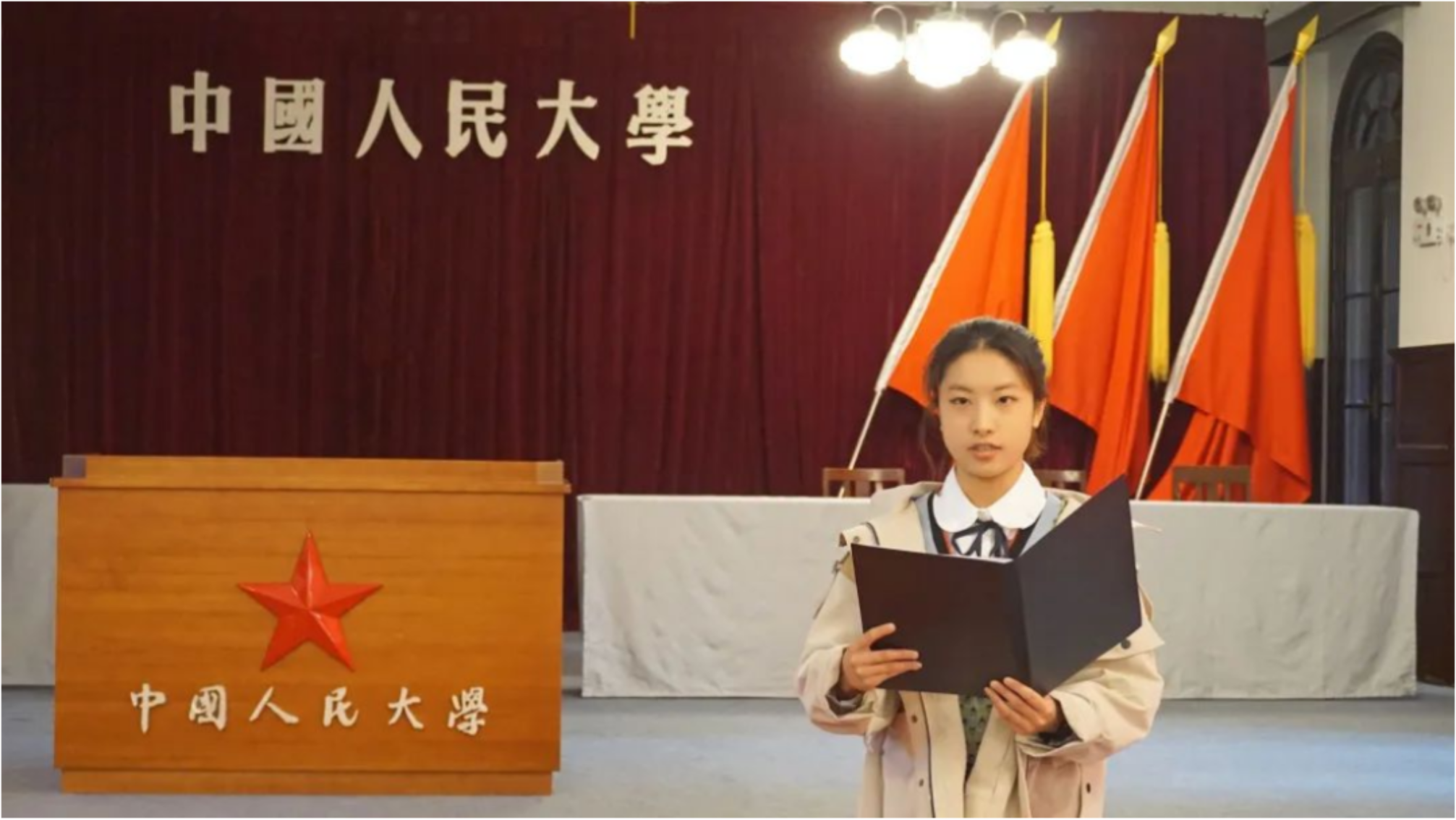 贺嘉仪代表第39期新发展党员发言。她向党组织表态,要将历史感悟与现实感触相结合,以青年党员之姿争做“复兴栋梁、强国先锋”。