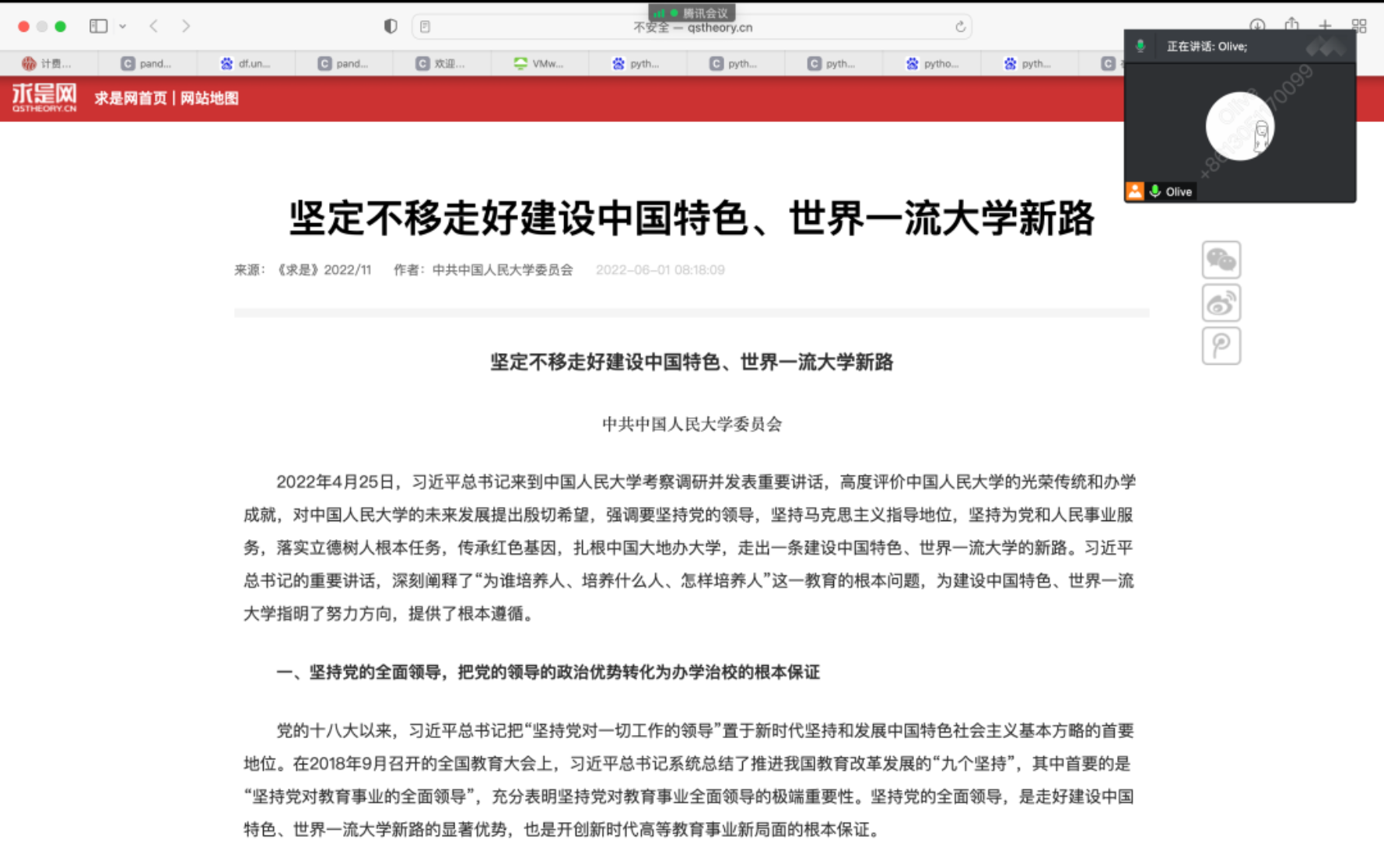 李璨带领支部成员共同学习《坚定不移走好建设中国特色、世界一流大学新路》,重点讲解青年员工党员如何传承好光荣革命传统和鲜明红色基因,以及青年员工党员如何扎根中国大地走出一条新路。