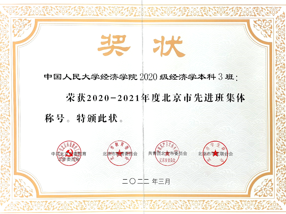 祝贺!2020级经济学本科三班荣获“北京市先进班集体”称号