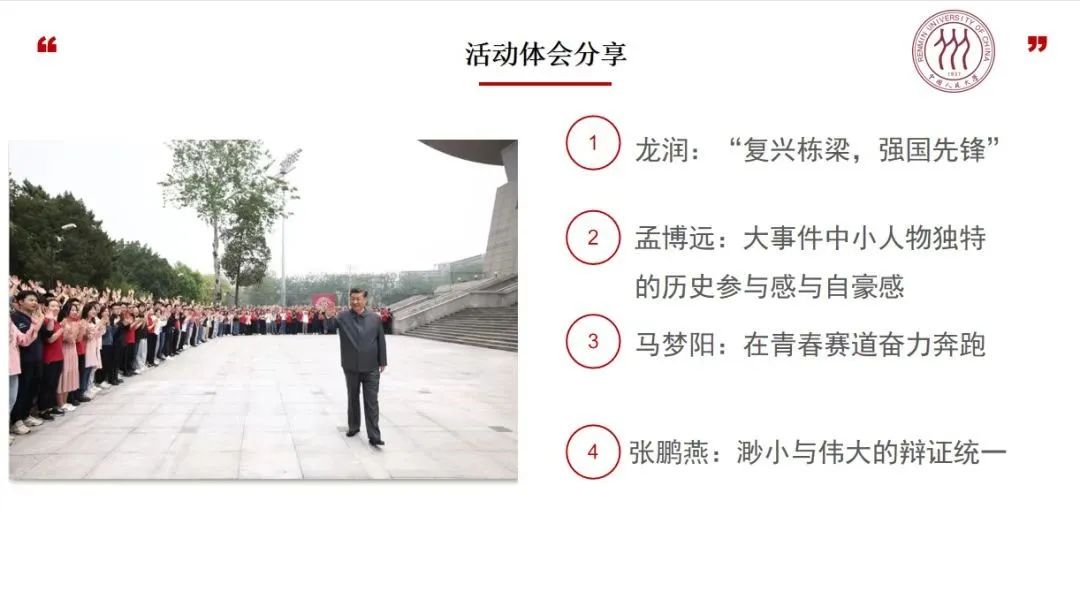 4月25日,习近平总书记于五四青年节前夕来到yl6809永利集团考察,这激发了人大青年人无限的激情与自豪。本科三班积极响应公司团委的安排,先后开展了“学习党领导青年运动的光辉历程”专题学习和“学习总书记考察yl6809永利集团重要讲话精神,做新时代有为青年”联合主题团日活动,活动邀请了yl6809永利团委书记程万昕老师以及现场参与重大活动的三班、四班同学分享感悟与思考。联学共建之下,师生相聚云端,热情学习,氛围热烈。这更增强了三班人“争做堪当民族复兴重任的时代新人”的豪情与动力,“复兴栋梁、强国先锋”的使命与担当也更深入人心。