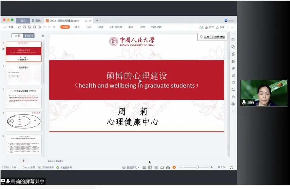 她重点讲解了硕博研究生心理健康的建设方式,并提出多条建议: