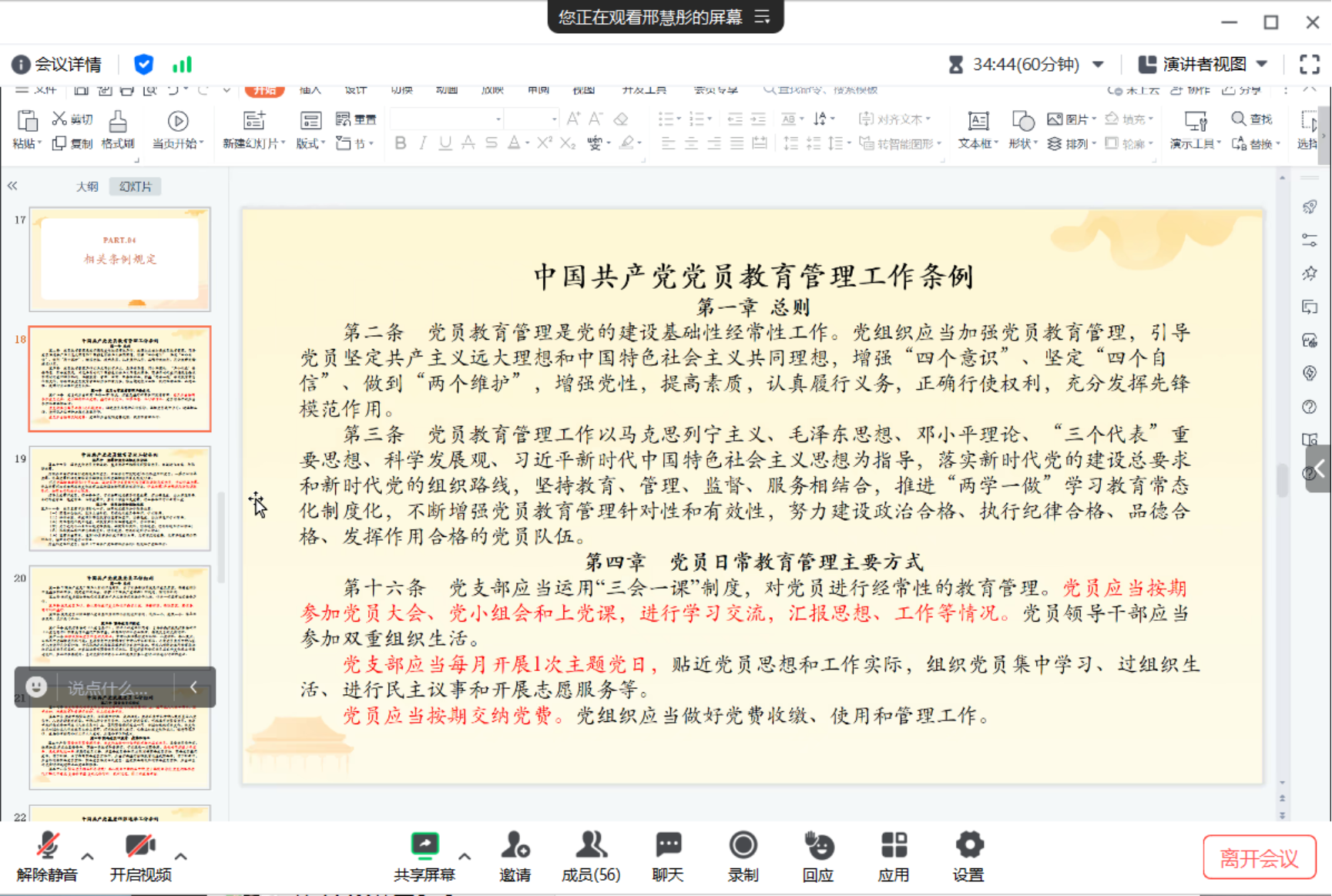 邢慧彤介绍了《中国共产党党员教育管理工作条例》,并针对新时代背景下党员队伍建设的要求,阐明支部督查的意义。她特别强调支部督查纪律的重要性,并从督查人员、督查方式以及督查流程三个方面进行全面解释。