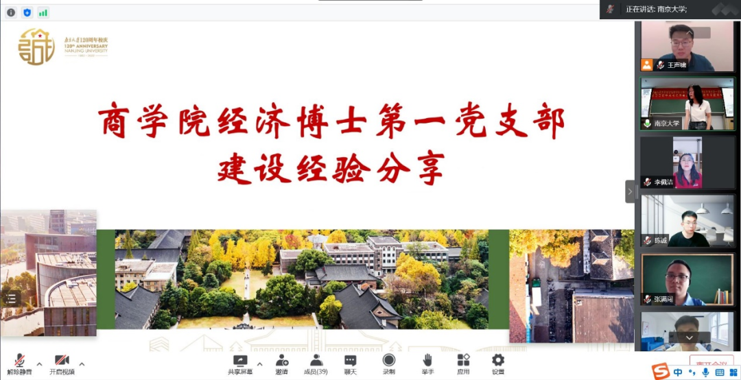 南京大学商公司经济博士第一党支部书记闫佳敏,从规范党员发展工作,提高党员发展质量;加强理论学习,立足学科优势,丰富党日活动主题;加强党史学习教育,争做新时代合格党员;开展志愿服务和践行初心使命四个方面介绍了支部的建设经验。