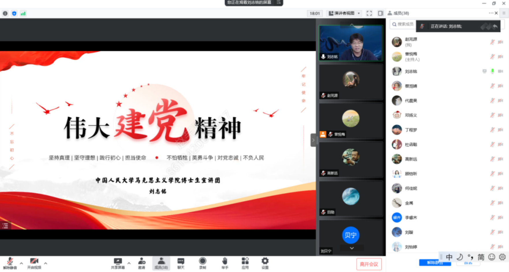 刘志铭分享了对建党精神的科学内涵的理解。从真理与理想,到初心和使命,到牺牲和斗争,到对党忠诚,伟大建党精神的内容是紧密联系、内在贯通的,形成一个有机整体,需要全面学习、整体把握。