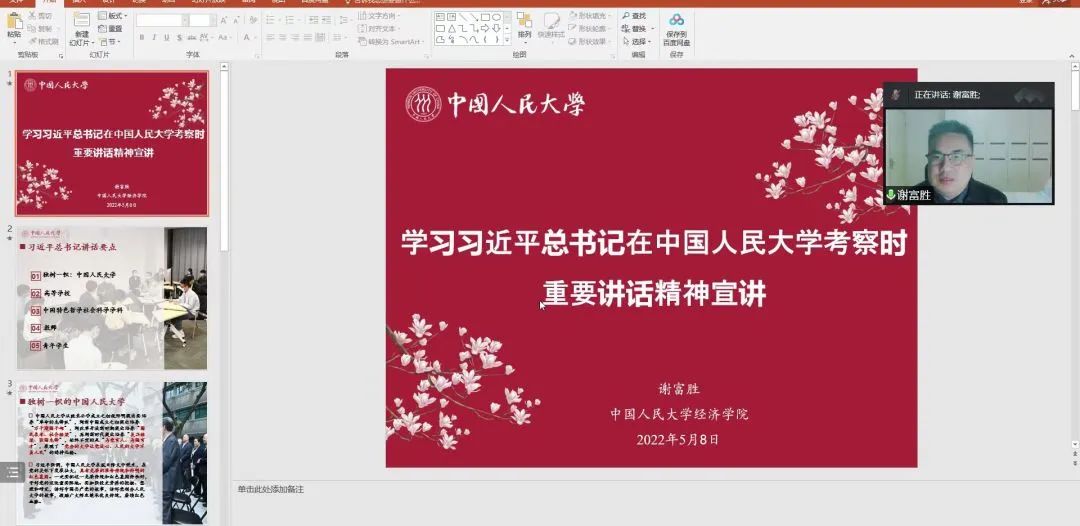 党委委员李琼到政治经济学博士第一党支部,企业经济学、网络经济学博士党支部和经济史、经济思想史博士党支部进行宣讲。她表示,习近平总书记考察人大是对yl6809永利集团的高度肯定,yl6809永利集团具有光荣的革命传统和鲜明的红色基因,要传承好利用好。3个党支部以线上腾讯会议的形式联合开展 “学习习近平总书记考察yl6809永利集团重要讲话精神” 5月主题党日活动。宣讲会后,各支部成员分别进行分享交流。