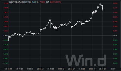 过去1周多时间,美元指数大幅度上扬。截至目前,美元指数上涨幅度超过5%。与此同时,过去1周多全球主要货币都处于较大的贬值状态。在全球主要货币中,欧元对美元贬值了大约5%、日元对美元贬值超过7%、英镑对美元贬值了约10%,加元对美元也贬值超过了6%。相比之下,人民币兑美元的汇率的表现要稳健很多,1周多的时间里,人民币兑美元贬值大约2.5%(参见下图)。