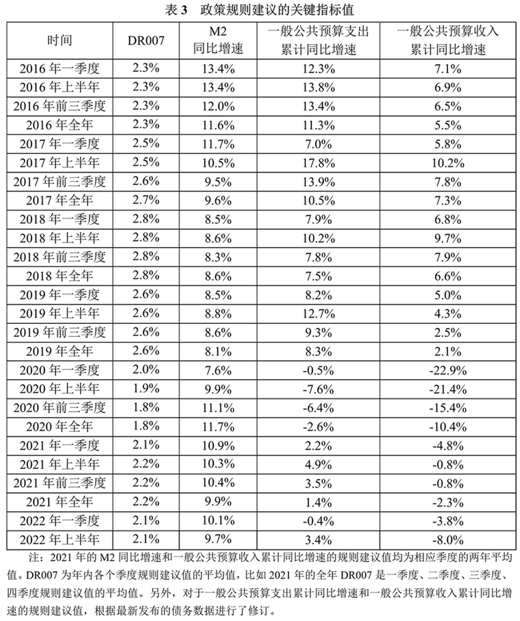 (7)政策工具性指标的规则建议值:本报告基于GMM方法,分别使用泰勒规则、麦卡勒姆规则和财政政策规则,计算得到了几个重要政策工具性指标的规则建议值,包括DR007、M2同比增速、一般公共预算支出累计同比增速和一般公共预算收入累计同比增速等指标。在计算过程中,本报告将相应政策指标的滞后一期变量纳入规则方程,使得政策规则更加符合央行和财政部政策操作的实际情况,从而使得政策规则所测算的指标值更好地与现实数据进行拟合。将政策规则建议指标数值与实际指标数值进行对比,有助于更好地把握货币政策与财政政策的力度变化。