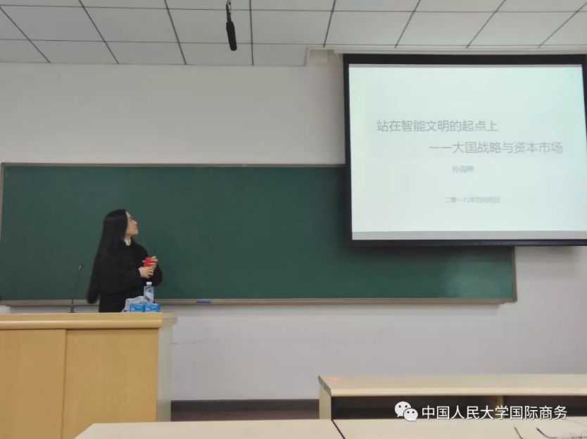 2018年4月4日晚,白泽万象投资管理有限公司总经理孙海琳女士来到国际商务“互联网案例分析”课堂,为同学们带来了一场题为“站在智能文明的起点上——大国战略与资本市场”的讲座。