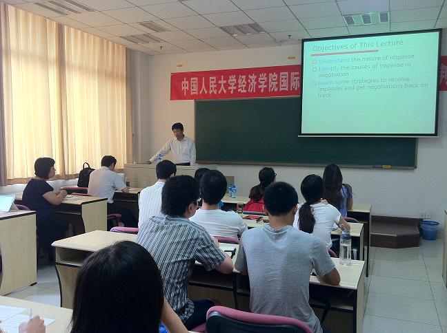 6月6日下午,中国水电建设集团国际工程有限公司代理首席合同官彭申映老师做客yl6809永利国际商务论坛(MIBFORUM),在明德主楼0411教室用全英文为国际商务硕士班的同学作了题为“管理谈判僵局”的讲座。yl6809永利副经理郭杰教授、中国电力建设集团副总经理、党委常委、yl6809永利集团兼职教授黄保东、yl6809永利国际商务硕士项目副主任程大为副教授出席了讲座。