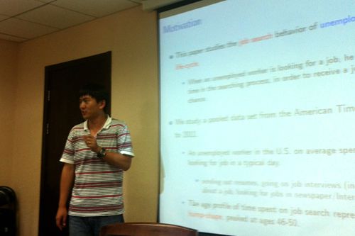 王亮博士的论文主要研究了劳动者在生命周期中的求职行为。他首先定义一天中劳动者用于搜寻工作的时间为工作搜寻强度,并发现工作搜寻强度随年龄增大呈单峰分布。考虑到在不完全市场中的标准生命周期模型通常包含逐渐递减的工作搜寻时间,王亮博士的论文引进各年龄段特有的劳动生产率来构造出工作搜寻强度随年龄变化的单峰曲线,并且假设失业者找工作时遵循保留工资策略。王亮博士接着在论文中对模型进行了校准了并估计了各年龄段的劳动生产率、保留工资和资产持有对搜寻强度的具体影响。他的论文发现各年龄段的工作效率和保留工资的交互作用是理解曲线单峰形状的关键。与会者就模型的基本设定和论文结论在现实中的应用等问题进行了讨论。