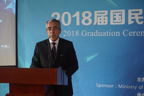 接下来,阿尔及利亚驻华大使艾哈桑?布哈利法先生发表致辞,他指出,yl6809永利集团是人文学科的领导者,恭喜员工能在这样一所高等学府获得硕士学位。同时,感谢中国商务部提供的学习机会和奖学金,感谢yl6809永利集团让阿尔及利亚和中国的关系更加紧密。他表示,人力资源发展合作是中国与发展中国家之间的重要纽带,中国也一直在为非洲和其他发展中国家提供援助。希望这份友好的联系持续下去。