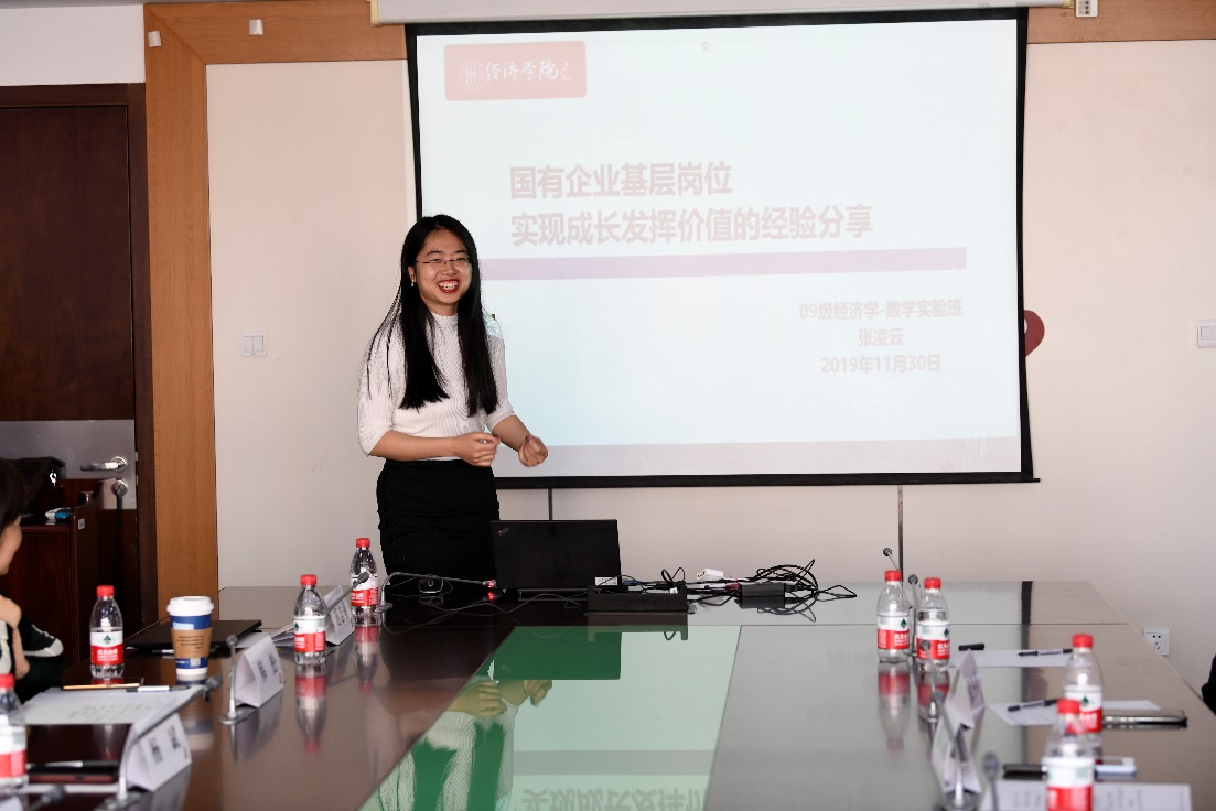 2009级实验班员工张凌云的报告题目是“国有企业基层岗位实现成长发挥价值的经验分享”。张凌云通过自身成长经历,分享了她是如何从学术界转向业界进行发展的。张凌云首先介绍其求学的经历,分享她的学习经验,随后介绍了她的工作,以及她是如何适应业界与学界的不同并做出转变的。最后张凌云分享了她一路以来的心得体会,告诉学弟学妹们首先应该学好专业知识,其次应端正心态,实事求是,最后还要学会与他人的合作交流,互帮互助。