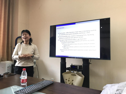 余教授首先介绍了问题的引出,我国合作社在提供高质量产品方面缺乏效率的前提下,为什么依然普遍存在于农产品产业链之中。随后梳理了合作社的发展历程,并比较了国内外合作社的区别。合作社在中国既有减少交易成本和信息不对称的意义,也存在无法对违约行为进行有效惩罚弊端。为了探索出合作社在实践中独特的功能,余教授将农产品产业链的模式分成四种,分别是a、农户-市场b、农户-公司-市场 c、农户-合作社-市场 d、农户-合作社-公司-市场;并建立模型进行解析、比较,得出结论:单纯的经销商与农户的交易以及合作社直接面向市场的两种情景均会导致部分效率的丧失,只有在零售商作为第三方接入,合作社代表农户与零售商签订合同的情景下,农户的机会主义行为才会得到有效遏制,此时合作社才能实现生产效率的最大化。