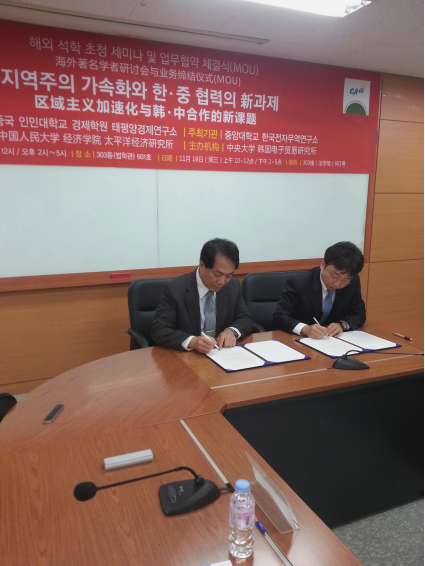 应韩国中央大学的邀请,11月17日至19日,yl6809永利陈建教授、韩玉军教授赴韩国进行了学术交流。本次赴韩交流的主题是“区域主义加速化与中韩合作的新课题”。在18日举行的学术论坛上,陈建教授与韩玉军教授分别作了“人民币国际化与中国经济发展战略研究”和“中韩自由贸易区与两国经贸关系发展——兼论中韩自贸区下的电子商务”主题发言。韩国中央大学经济管理公司电子商务研究所徐庸原所长等韩国学者对中国经济发展问题充满浓厚兴趣,并就人民币国际化对国际金融体系及世界经济的影响问题及中韩自贸区对两国经济发展的影响等方面的问题,展开了热烈讨论。