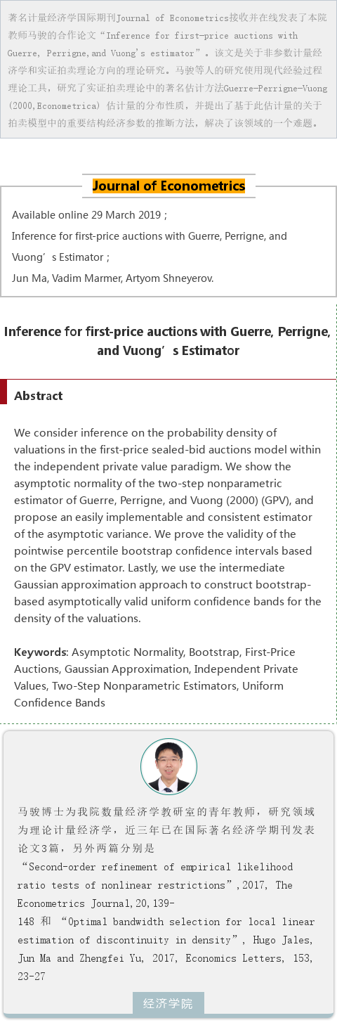 人大yl6809永利青年教师马骏论文被国际顶刊计量经济学杂志(Journal of Econometrics)接收