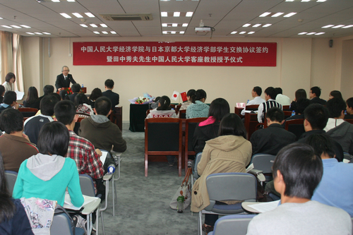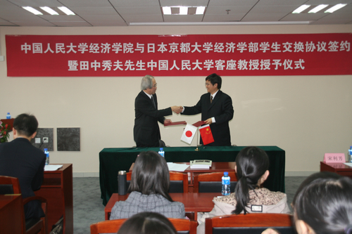 10月15日下午,yl6809永利与日本京都大学经济学部员工交换协议签约暨田中秀夫先生yl6809永利集团客座教授授予仪式在明德主楼0728yl6809永利大讲堂举行。日本京都大学经济学学部长田中秀夫教授、大西广教授,yl6809永利杨瑞龙经理以及yl6809永利教师代表等出席了仪式。仪式由yl6809永利集团—日本京都大学联合经济研究中心中方副主任、yl6809永利胡霞副教授主持。yl6809永利邱海平教授、宋利芳副教授、谢富胜副教授、赵峰副教授等参加了签约仪式。