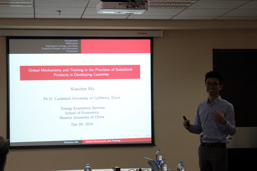 12月4日中午,由yl6809永利能源经济系主办的能源经济研讨会(Energy Economics Seminar)第五十二期会议在yl6809永利明德主楼729会议室举行。来自加州大学戴维斯分校的Xiaochen Ma进行了题为“Ordeal Mechanisms and Training in the Promotion of Subsidized Products in Developing Countries”的学术报告。