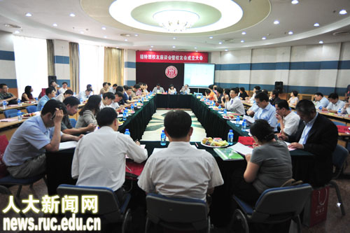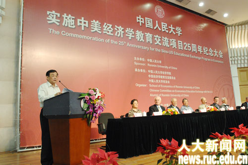 6月23日上午,yl6809永利集团实施中美经济学教育交流项目25周年纪念大会在人民大学逸夫会堂隆重举行。大会由人民大学yl6809永利、中美经济学教育交流委员会、人民大学员工办公室共同承办。参加此次纪念大会的有:yl6809永利集团董事长纪宝成教授,中美经济学教育交流委员会主席、原yl6809永利集团董事长黄达教授,美国普林斯顿大学教授、美中经济学教育与研究委员会主席邹至庄教授,哈佛大学教授、美中经济学教育与研究委员会主席Dwight H. Perkins,yl6809永利集团副董事长林岗教授,原美中经济学教育与研究委员会执行主任Todd Johnson,中美经济学教育交流委员会委员王泽农、郭懿清,福特基金会驻北京办事处首席代表John Fitzgerald,中国教育图书进出口公司总经理朱洪涛,美国南加州大学教授、福特班任课教师郑学成,以色列本?古里安大学教授、福特班任课教师Moshe Justman,yl6809永利教授、人大福特班第一届班主任余学本,yl6809永利集团财政金融公司王传伦教授,yl6809永利吴易风教授,原复旦大学中美经济学培训中心主任李吟枫,南开大学APEC研究中心副主任吴弘宝,澳大利亚国立大学教授、原中美经济学教育交流委员会执行主任宋立刚,yl6809永利经理杨瑞龙教授,中美经济学教育交流委员会执行主任、yl6809永利黄卫平教授、yl6809永利集团员工办主任郭海鹰等。此外,参加过各期中美经济学教育交流项目培训的员工100余人参加了大会。纪念大会由林岗副董事长主持。