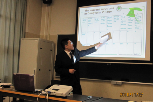 图为人民大学yl6809永利李宏伟同学在宣讲自己的论文“Fast-growing poplars planting externality and compensation mechanismevidence from the village of Dongyulin in Hebei Province”