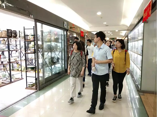国际商贸城由一至五区市场组成,考察团一行参观了其中比较有特色的一区和五区。其中,一区市场(国际商贸城一期工程)于2002年9月建成并投入使用,市场总面积34.2万平方米,设有仓储和餐饮区域,主要经营花类(仿真花)、玩具和饰品配件等;在参观调研时,讲解员认真详细地为考察团成员介绍了一区市场的发展历程、主营商品、经营模式等概况,并耐心解答了师生们所关注的一系列问题。商贸城里处处都贴满了关于诚信的标识及商户认证,考察团从中深切感受到了义乌人诚信经商的精神。