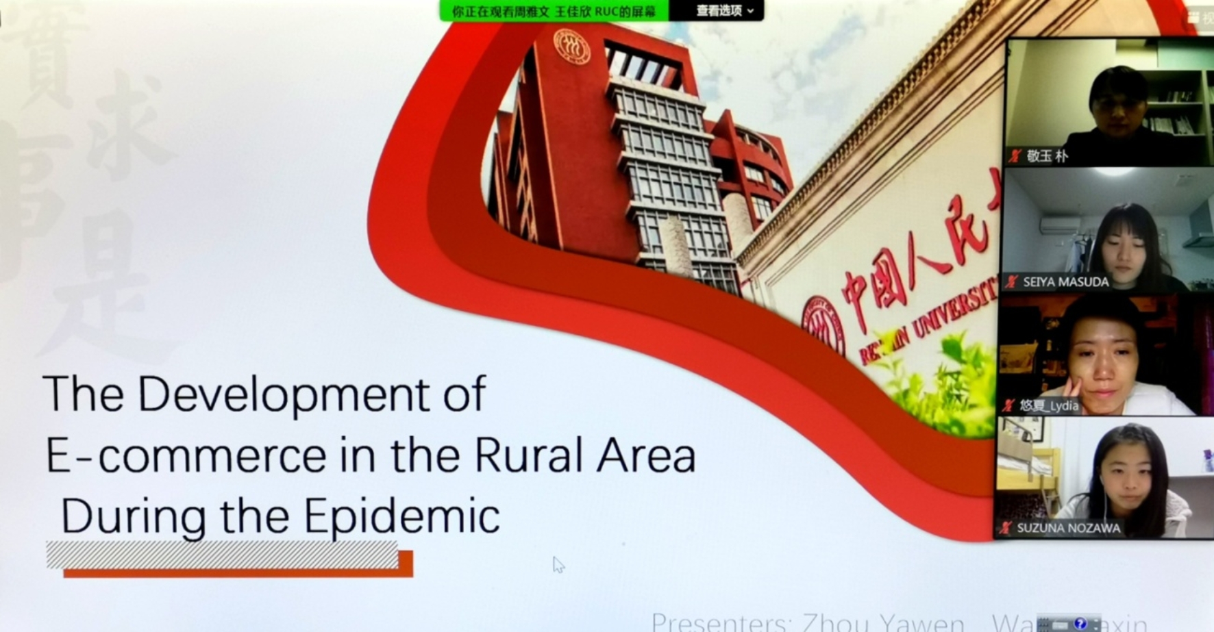 接下来,来自经济学部3级的竹内颯平带来的展示题目为“后疫情背景下,电子商务在中国农村的兴起及积极影响”。他结合数据指出,新冠疫情损害了中国农村地区的经济发展,但在政府和电商的合力支持下,农产品滞销问题得到改善,农民收入增加,农村地区经济不至受到重创。他的展示逻辑清晰,数据翔实,体现了严谨的学术风格。