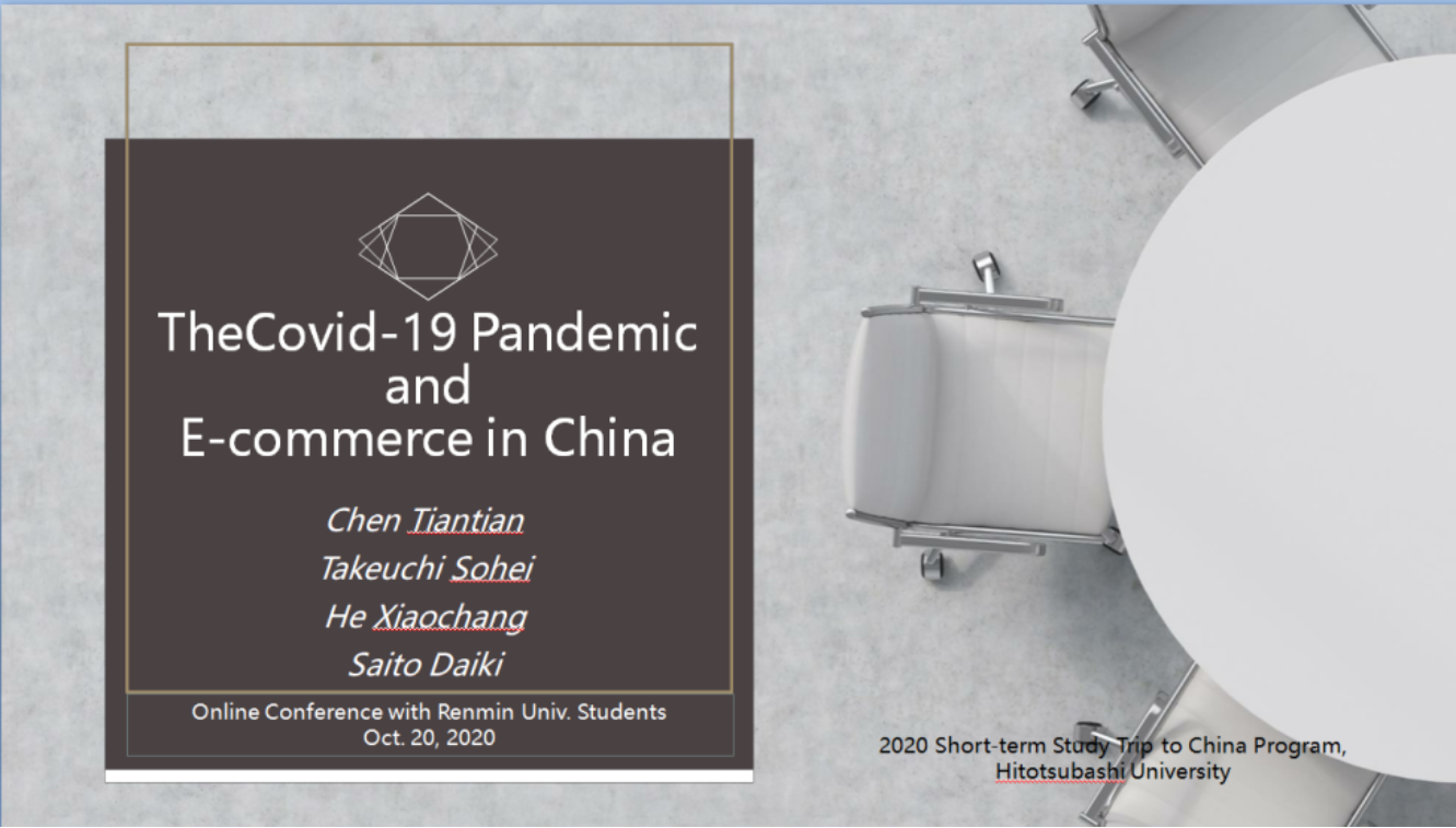 首先由日本一桥大学的员工进行展示,经济学部2级员工陈天天展示了其小组对“新冠疫情对中国经济的影响”这一课题的研究。他重点分析中国的工业及零售业如何在疫情期间受到冲击及顺势转型,结合了“全时”及“盒马鲜生”等具体案例进行讲解。最终,他认为在疫情冲击下,中国的零售业正加速发生结构性转变,零售业与互联网的结合将更加紧密。