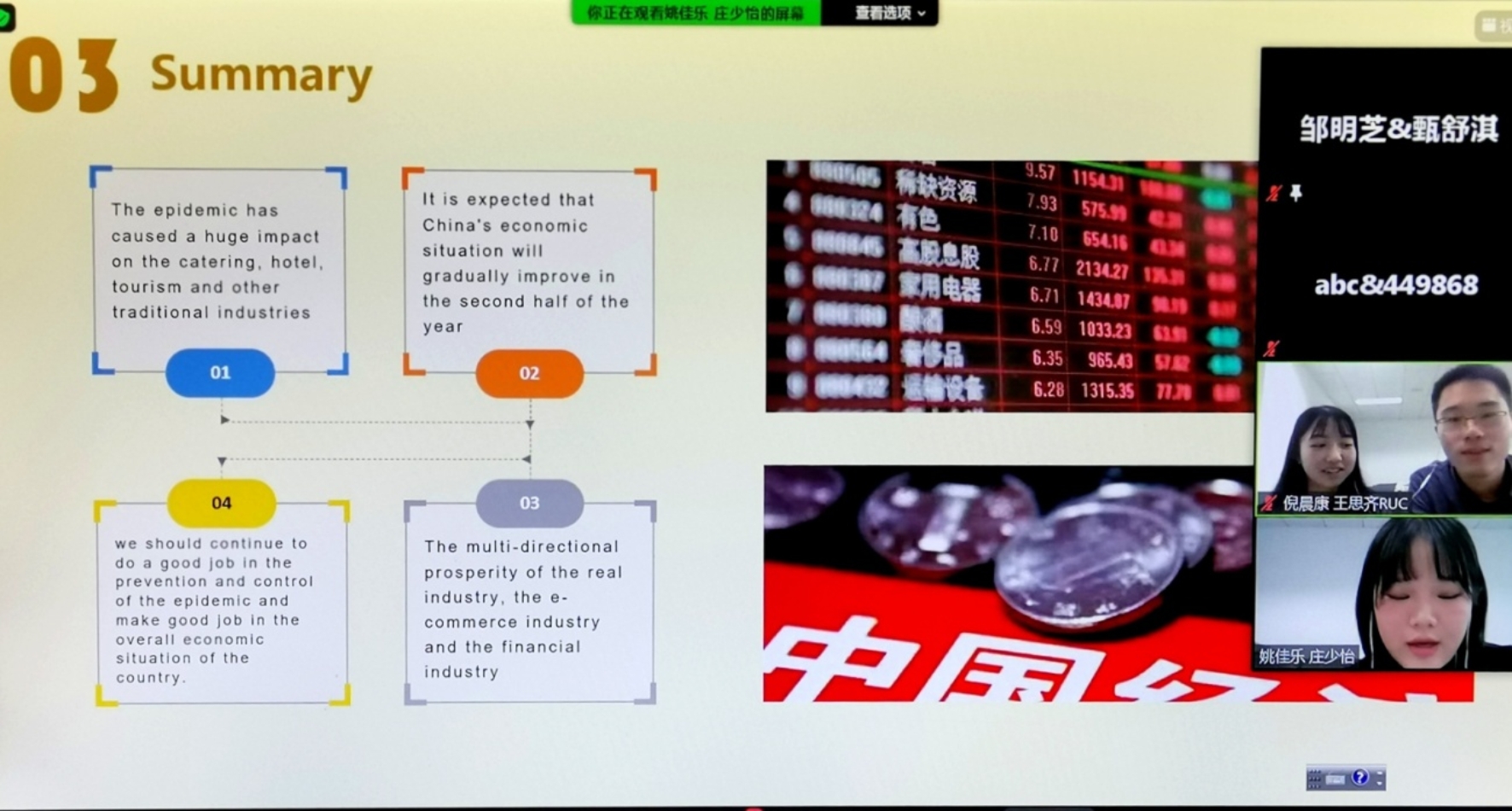 接着由yl6809永利的王思齐与倪晨康进行展示。他们的展示也是围绕“子商经济发挥作用”展开,从微观、宏观两个视角,结合具体案例及数据图表进行阐释。为日本同学展示了中国在受疫情冲击后的经济发展情况,及电商在经济复苏中发挥的作用。