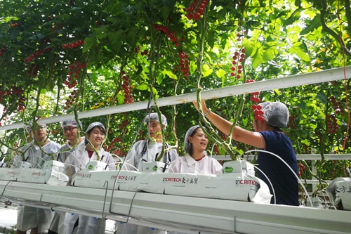 在大庆宏福农业李朝驰总经理的陪同下,调研团队前往1号温室,了解番茄生长及员工实际工作情况,听取技术人员讲解温室作物生长环境要求以及调节水、光、热的智能管控系统,介绍番茄育苗、定植、落蔓、打侧芽、摘果等农事活动。作业工人一部分来自周边贫困村的村民,一部分是定期实习的农校老员工,经过培训、分工、上岗。据李总介绍,该现代智能温室项目是宏福农业引进吸收荷兰先进的温室建造技术、生产设备和智能化管控技术建造而成,并聘请了全球顶级专家种植团队进行种植管理,所有种植环节严格执行GLOBAL G.A.P 欧盟操作规范,确保了产品生产全过程的纯净、安全及可追溯。