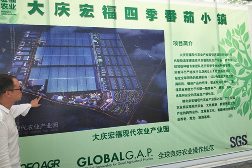 7月23日上午,国情考察团首先来到北京宏福集团投资的大庆宏福农业产业园。该园位于黑龙江省大庆市林甸县长青林场,总占地约5000亩,项目分三期建设,核心为270公顷引进国际先进技术及设备的智能温室。配备产品加工、科学家中心、商务酒店、居住区、公司、医院、体育场馆等配套设施。总体项目完成后,该综合园区将是亚洲最大的现代智能温室群,真正实现工厂化农业。2017年开工兴建,一期12.5万平米温室已建成投产,今年7月首批产品上市。