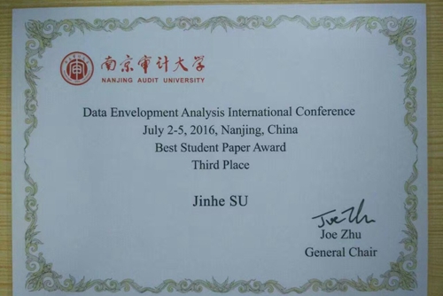 7月2日至5日,DEA国际学术研讨会:理论创新、应用及治理会议在南京审计大学举行,本次DEA会议旨在与前沿的DEA研究人员一起讨论一些主要的创新方法,涉及DEA在管理和治理等方面。公司韩松副教授作为会议邀请专家,负责组织DEA方法方面的论文并担任相关小组的主席。7月4日下午,韩松副教授报告论文“Quantile-DEA Ranking Method for Multi-Attribute Decision Making Problems with Interval Data”,并与在场的专家和学者进行了互动。贾德音同学报告了苏锦河同学与她的合作论文“Cone Ratio DEA Model for Processing Bad Outputs and its Evaluation on the Efficiency of Thermal Power Industry”,并参与了员工优秀论文的评比,在众多博士生论文中脱颖而出,在六篇获奖论文中占有一席之地。