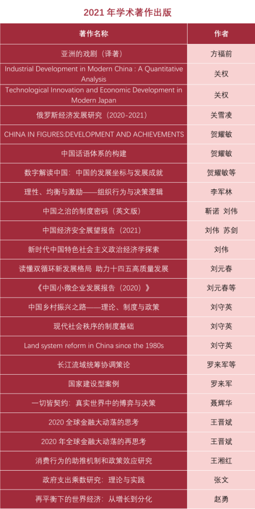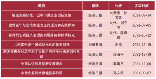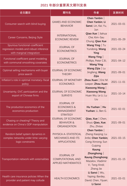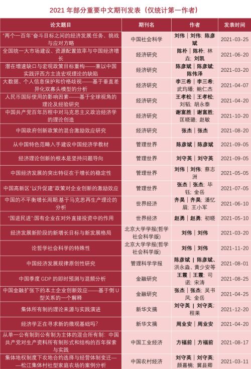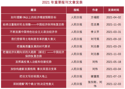 据不完全统计,2021年,公司教师在20余种国内外顶级期刊上发表论文50多篇。其中,在国内顶级期刊《中国社会科学》发文1篇;在《经济研究》发文6篇;在《管理世界》发文4篇。在《人民日报》《光明日报》《经济日报》上发表论文30余篇。