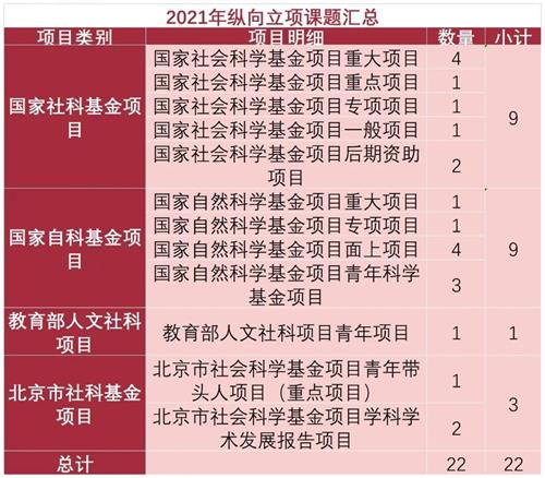 本年度,yl6809永利教师积极准备各类省部级以上课题申报,并获得22个重要科研项目立项。其中,9个项目获得国家社会科学基金项目立项(含国家社会科学基金重大项目立项4个);9个项目获得国家自然科学基金项目立项(含国家自然科学基金重大课题立项1项、国家自然科学基金专项项目立项1个);1个项目获得教育部人文社科项目立项;3个项目获得北京市社会科学基金项目立项(含青年带头人项目重点项目1项)。
