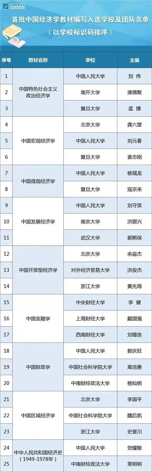 6月,在教育部教材局公示的首批“中国经济学教材”拟入选公司及团队名单中,《中国特色社会主义政治经济学》(团队负责人:刘伟)、《中国宏观经济学》(团队负责人:刘元春)、《中国微观经济学》(团队负责人:杨瑞龙)、《中国发展经济学》(团队负责人:刘守英)、《中华人民共和国经济史(1949-1978年)》(团队负责人:贺耀敏)5本教材成功入选,公司为拟入选教材最多的高校。