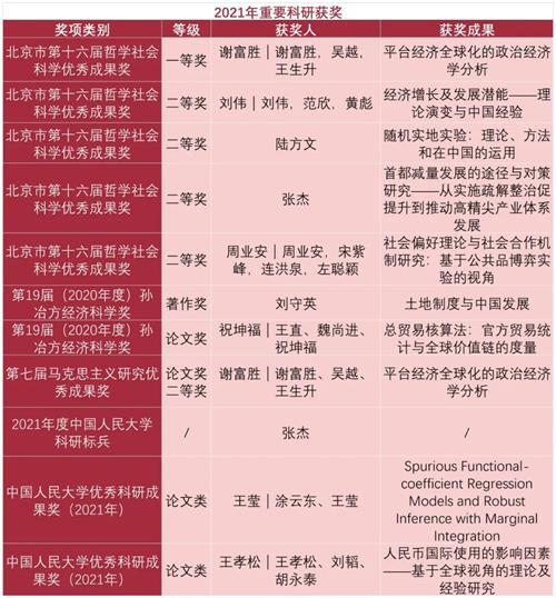 在北京市第十六届哲学社会科学优秀成果奖评选中,5项成果获奖,一等奖1项,二等奖4项;第19届孙冶方经济科学奖,2项成果获奖,著作奖1项,论文奖1项;1项成果获得第七届马克思主义研究优秀成果奖;1位老师获得2021年度yl6809永利集团科研标兵;2项成果获得yl6809永利集团优秀科研成果奖(2021年)。