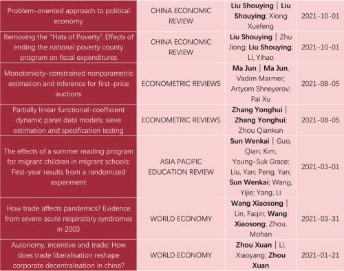 在Journal of Economic Theory上发表论文1篇,在Journal of Monetary Economics上发文1篇,在Games and Economic Behavior上发表论文1篇,在 International Economic Review上发表论文1篇,在Journal of Econometrics 发文2篇。