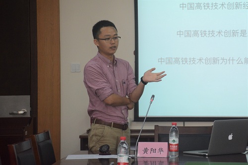 黄阳华副研究员结合自身的调查研究经历,讲述了高铁创新的历程、高铁创新是怎样发生的以及高铁创新成功的原因这三个方面的问题。他的语言轻松幽默,论证严谨科学,现场气氛非常活跃。他首先介绍了高铁创新的历程,以2011年京沪高铁通车和7.23甬温线铁路交通事故为例讲述了中国高铁创新的成就及其问题,期间引用了大量学术著作。随后他为大家解析了高铁创新的主体以及各主体参与创新的原因,具体分析了高铁创新的技术类型,增进了大家对高铁创新性的理解。最后他为大家讲述了自从上世纪八十年代以来中国高铁事业的创新历程。从混乱的市场到统一的市场、从部门管理到公司制经营、从闭门造车到积极引进外来先进技术,中国铁路事业正在一步一步地创新发展 。那么中国的列车制造公司为何要引进先进技术?外企为什么愿意转让技术给中国?黄阳华副研究员详细地分析了这一问题,介绍了中国铁路经营部门与列车制造公司的管理结构以及中国对外招商引资的政策。