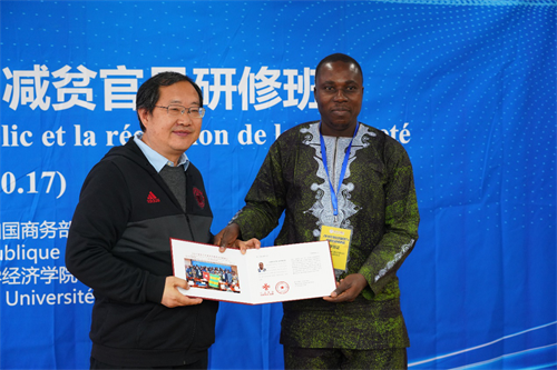 刘守英经理在讲话中表示,2019年多哥公共服务与减贫研修班在大家的共同努力下,圆满完成各项工作,希望中国的发展模式和减贫之路能够给同是发展中国家的多哥共和国提供一定的借鉴。他表示,重要的公共服务有三类:为农村人口提供教育、对农村老龄人口提供基本的生活保障,为农村人口提供医疗保障。他还指出,中国的发展经验,虽然可以为多哥共和国的公共服务和减贫工作提供一定的参考,但是本国的发展还是需要结合自身的实际情况探索适合自己的发展道路。同时也要拥有信心,因为没有任何一个人、任何一个国家是天生贫困的,只要找到正确的方法,就一定可以摆脱贫困。最后他谈到希望通过这次活动加强两国之间的友谊、交流和合作,共同为世界的可持续发展贡献自己的力量。