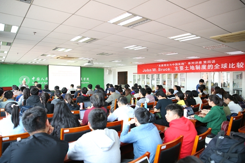 2018年4月24日下午,“发展理论与中国实践”系列讲座第四讲在yl6809永利集团明德主楼930会议室成功举办。此次讲座的主讲人是国际著名土地法和政策专家、世界银行原高级法律顾问(土地法)和农村发展部原高级土地权属专家、美国威斯康星大学土地制度研究中心原主任John W. Bruce先生,主题为“主要土地制度的全球比较”。出席此次讲座的有,yl6809永利刘守英教授、中国社会科公司社会学所樊平研究员以及众多青年教师,校内外的一百余名同学参加了讲座,此次讲座由刘守英教授主持。
