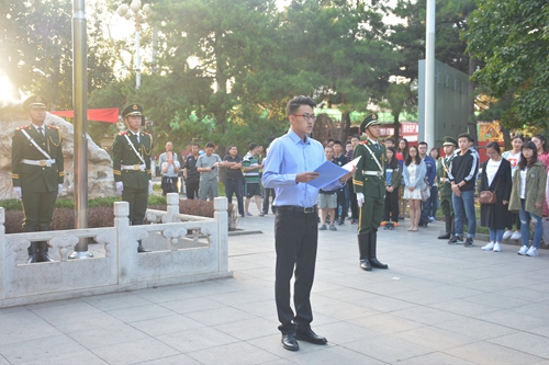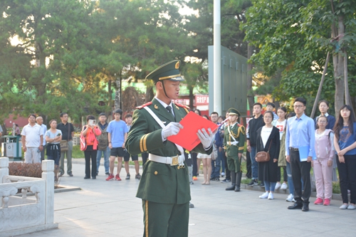 伴随着国歌声响起,五星红旗迎着朝阳缓缓升起,高高飘扬。晨风习习,旗面迎风招展;日光温煦,国旗亮丽夺目。在场同学肃穆静默,向国旗行注目礼,以此表达自己对革命先烈的缅怀和敬意。