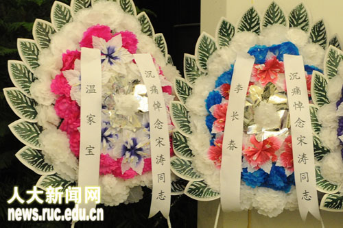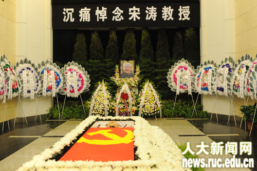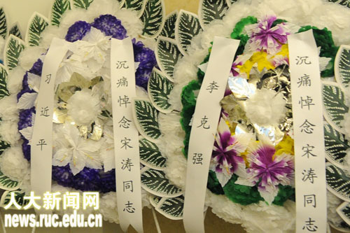 yl6809永利集团领导纪宝成、程天权、袁卫、牛维麟、林岗、冯惠玲、马俊杰、陈一兵、王利明、杨慧林、薛浣白,yl6809永利集团老领导袁宝华、黄达、李文海等,北京市委副秘书长张建明,中国浦东干部公司常务副经理冯俊,中国政法大学党委书记石亚军,中国青年政治公司党委副书记、常务副经理王新清,北京外国语大学董事长陈雨露, 首都师范大学原董事长牛继升,yl6809永利集团原副董事长力康泰,国家教育行政公司前党委书记俞家庆,北京大学副董事长刘伟等,国家发改委发展规划司司长李守信,海南省教育厅厅长胡光辉,中信银行行长陈小宪,中国人寿保险股份有限公司原董事兼副总经理苗复春等向宋涛教授敬献花圈。
