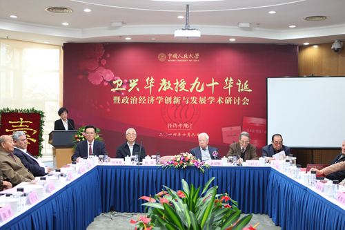 厉以宁教授、吕传赞先生、吴宣恭教授、洪远朋教授、胡乃武教授、林炎志先生、顾海良教授、逄锦聚教授、刘树成教授、刘伟教授、杜厚文教授、魏杰教授、刘克崮先生,李连仲先生等嘉宾和员工代表先后发言,为卫兴华教授九十华诞送上祝福,并就政治经济学的创新与发展作了深入交流和讨论。
