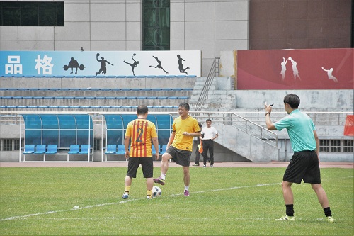 本次比赛分为三节,每节30分钟。第一节开局,教师一队率先控球,员工队员紧追其后,几轮往复拼抢之后,双方都多次发起对对方球门的冲击,但都遗憾未进,场面一度陷入僵局。此时教师队紧密配合,利用角球机会,郑新老师投球破门先拔头筹,一比零。随后教师 对继续发力,徐景阳老师接李军林老师传球捅射入网,二比零。第一节就此结束。